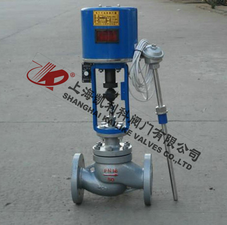 由單座調(diào)節(jié)閥、電動(dòng)執(zhí)行機(jī)構(gòu)、溫度傳感器和溫度調(diào)節(jié)器等部件組成,根據(jù)用戶需要,分別有加熱型與冷卻型兩種結(jié)構(gòu)。加熱型調(diào)節(jié)閥的結(jié)構(gòu)與原理,工作前主閥芯處于半開位置,傳感器處于自然狀態(tài)。接上電源,主閥芯全開。介質(zhì)由箭頭方向流入主閥體、經(jīng)閥芯對儲(chǔ)熱箱進(jìn)行加熱。當(dāng)溫度升到相應(yīng)設(shè)定值時(shí),傳感器即產(chǎn)生相應(yīng)線性信號輸入一體化執(zhí)行機(jī)構(gòu),隨即驅(qū)動(dòng)閥桿、閥芯產(chǎn)生位移,關(guān)閉主閥芯停止加熱。當(dāng)溫度低于設(shè)定值時(shí),傳感器即產(chǎn)生線性信號輸入一體化執(zhí)行機(jī)構(gòu),驅(qū)使閥芯漸開,使介質(zhì)按拋物線特性流入儲(chǔ)熱箱,進(jìn)行加熱直至設(shè)定值。這樣被控介質(zhì)始終在設(shè)定溫度范圍內(nèi)被控制,從而達(dá)到控溫目的。